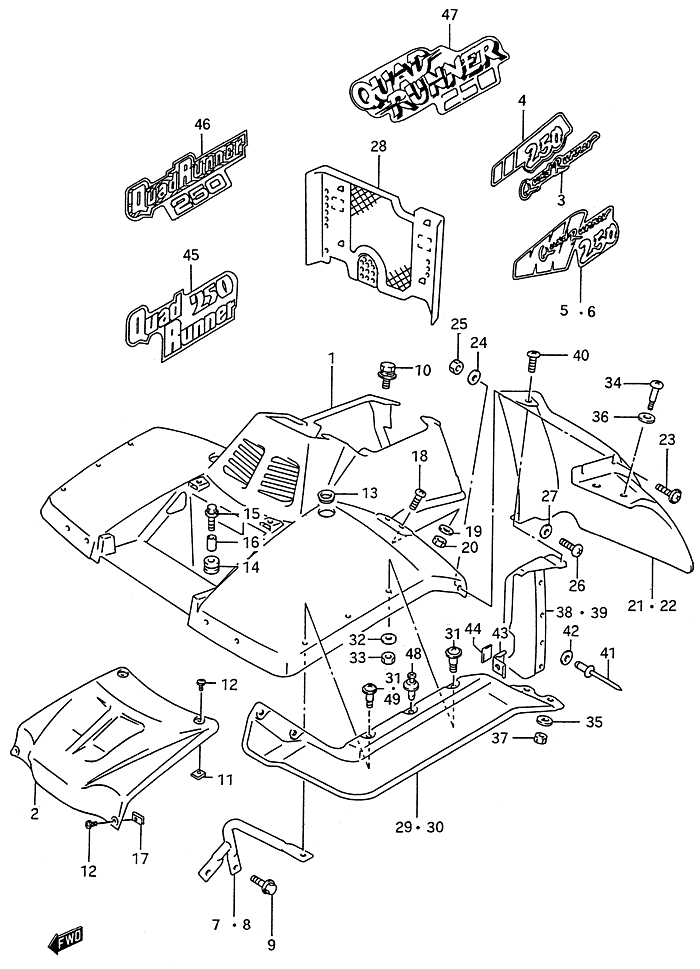 44-Etukate, LT-F250 ( nelitahti ) 1988-2011, 250 cc, Suzuki ATV / mönkijät -varaosa luettelot