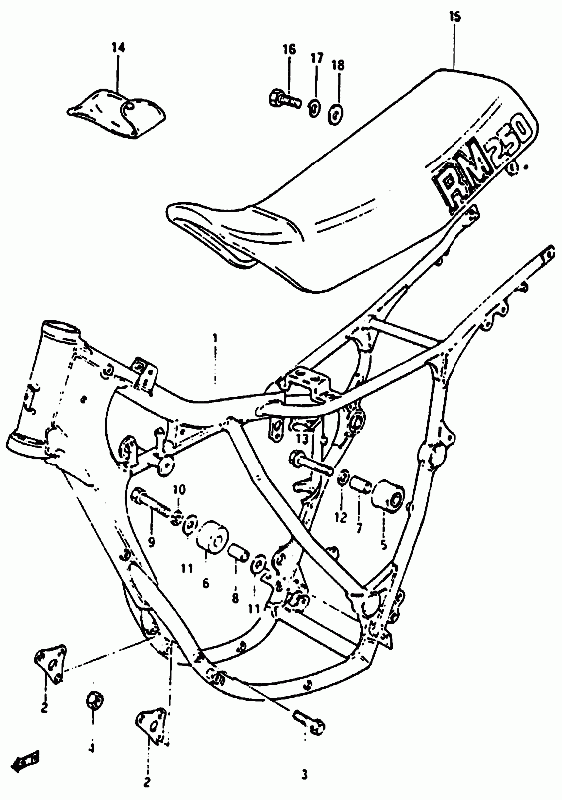 16-Runko, istuin, RM-250 E,F 1984-1985, RM-250 Alkuperäisluettelot, RM-250, 250 cc Motocross, Suzuki-varaosa luettelot