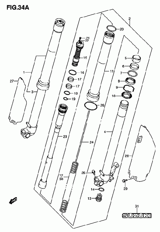 34A-Etuhaarukka, RM-Z250 K7-K9 2007-2009 , RMZ 250 Alkuperäisluettelot, RMZ-250, 250 cc Motocross, Suzuki-varaosa luettelot