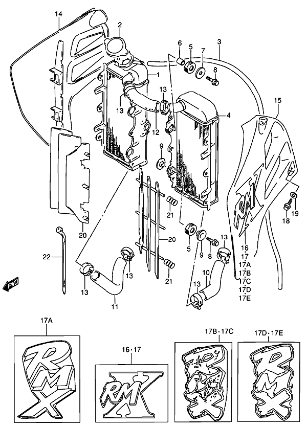 16-Jäähdyttimet, ilmaohjaimet, RMX 250 K, 250 cc, Suzuki-varaosa luettelot