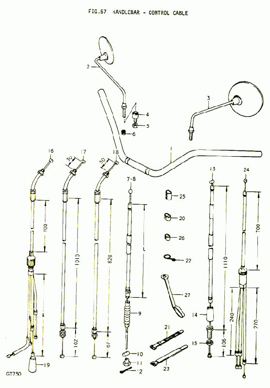 57-Ohjaustanko, vaijerit, peilit, GT 750 72-75, 750 cc, Suzuki-varaosa luettelot