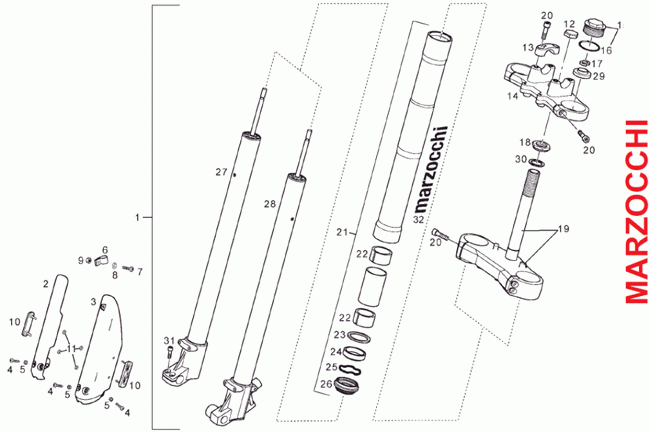 13-Etuhaarukka Marzocchi, SENDA SM 02-10 SA2A, 50 cc Super Moto mallisto, Derbi-varaosa luettelot