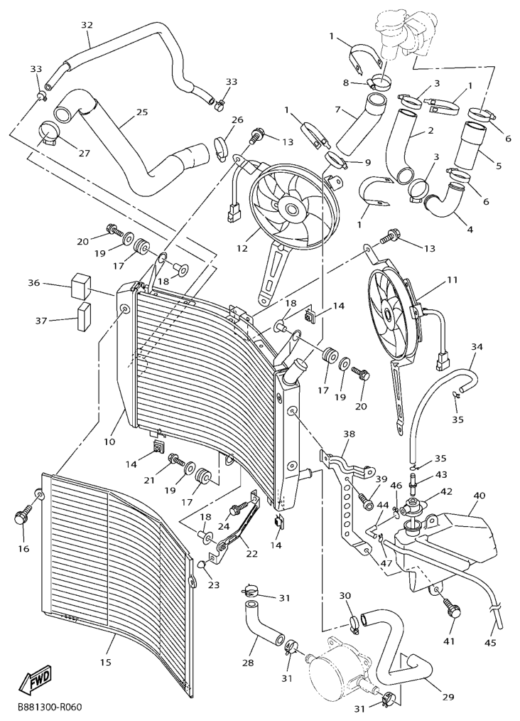 Jäähdytin ja letkut, FJR1300A 2016, FJR1300, 1300 cc, Yamaha -varaosa luettelot