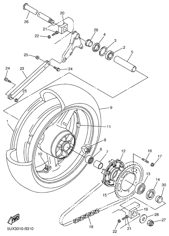 Takapyörä, XJR1300 2009, XJR1300, 1300 cc, Yamaha -varaosa luettelot