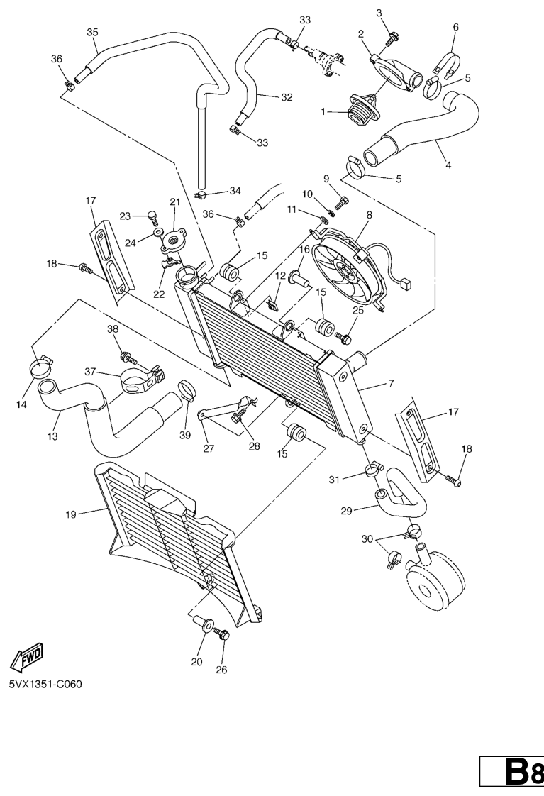 Jäähdytin ja letkut, FZ6-S 2004, FZ6-S, 600 cc, Yamaha -varaosa luettelot