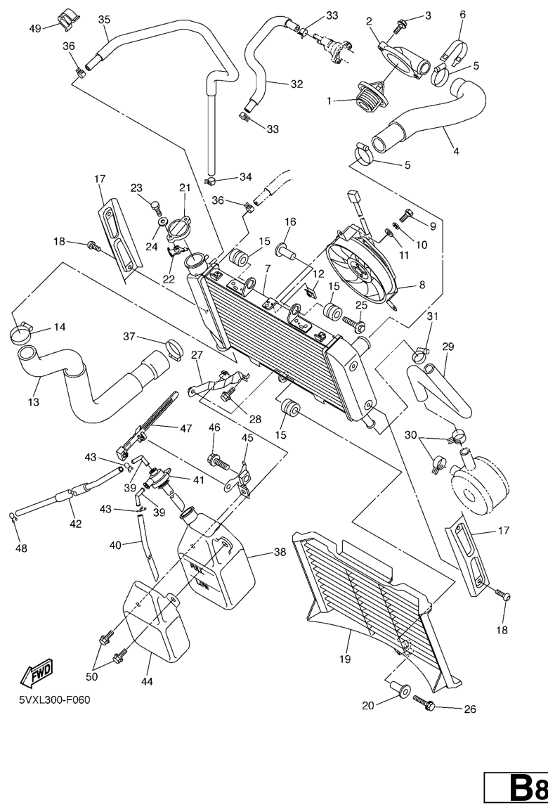 Jäähdytin ja letkut, FZ6-S2 2008, FZ6-S, 600 cc, Yamaha -varaosa luettelot