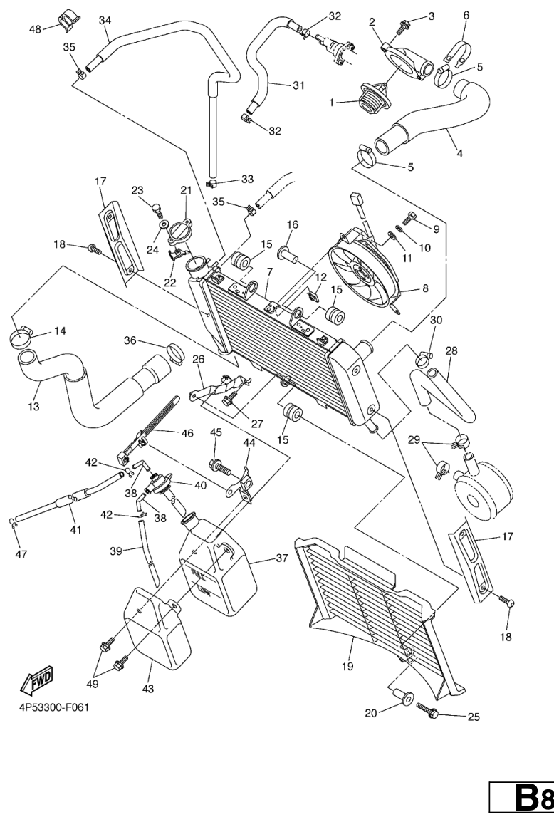 Jäähdytin ja letkut, FZ6-SA 2007, FZ6-S, 600 cc, Yamaha -varaosa luettelot